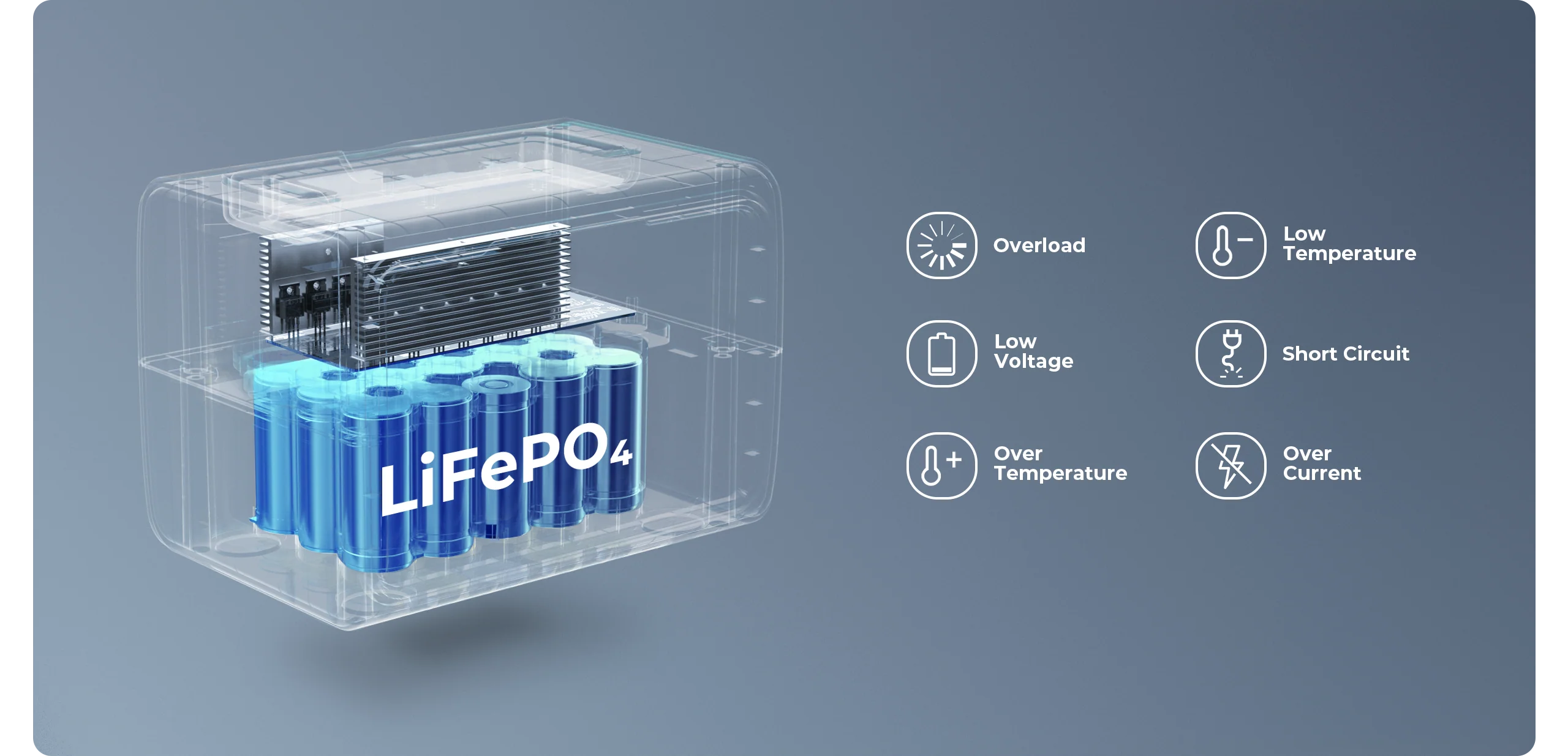LiFePO₄ chemistry integrated in BLUETTI battery-powered stations possesses a longer lifespan, higher discharge efficiency, and adaptivity to wider range of temperatures than traditional conterparts. It can also provide 100% of its rated capacity while maintaining optimum performance.